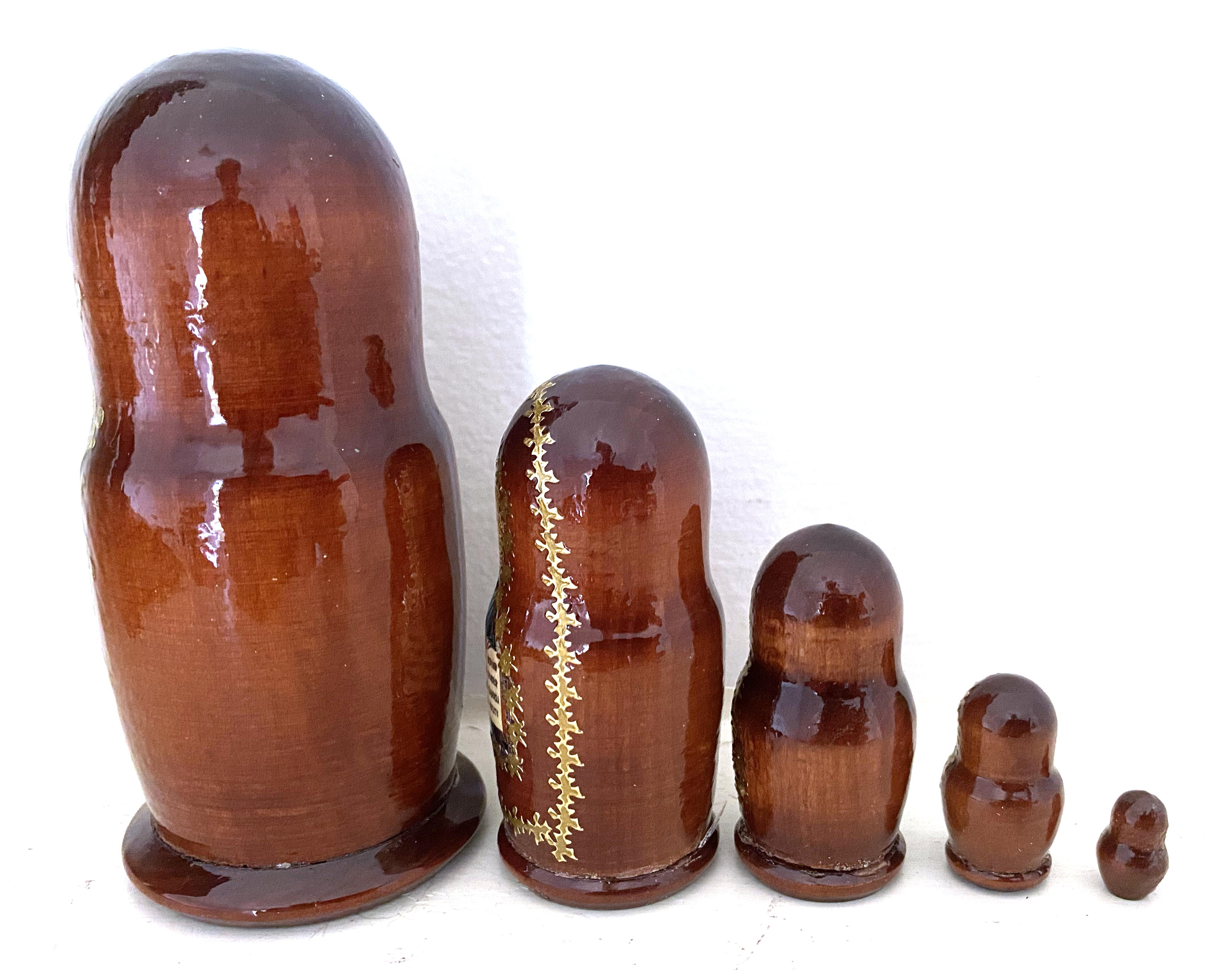 Step into the quiet beauty of Orthodox tradition with this small but powerful 5-piece icon-style matryoshka set. This set opens at the bottom rather than the middle as most matryoshka do.