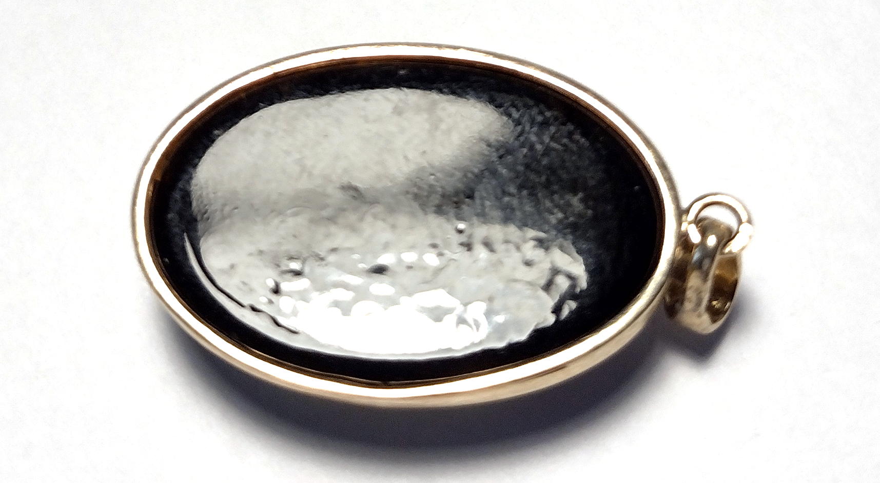 A stunning oval cabochon of natural Baltic green amber, beautifully set in a polished 9 carat gold bezel setting with a simple, elegant gold bail. The amber displays the characteristic deep, rich green colouration with striking golden-yellow internal flecks and inclusions that catch and refract the light, creating a mesmerising, almost galaxy-like appearance within the stone. The natural transparency of the amber allows light to illuminate the glittering internal structure, giving the piece exceptional depth and brilliance.