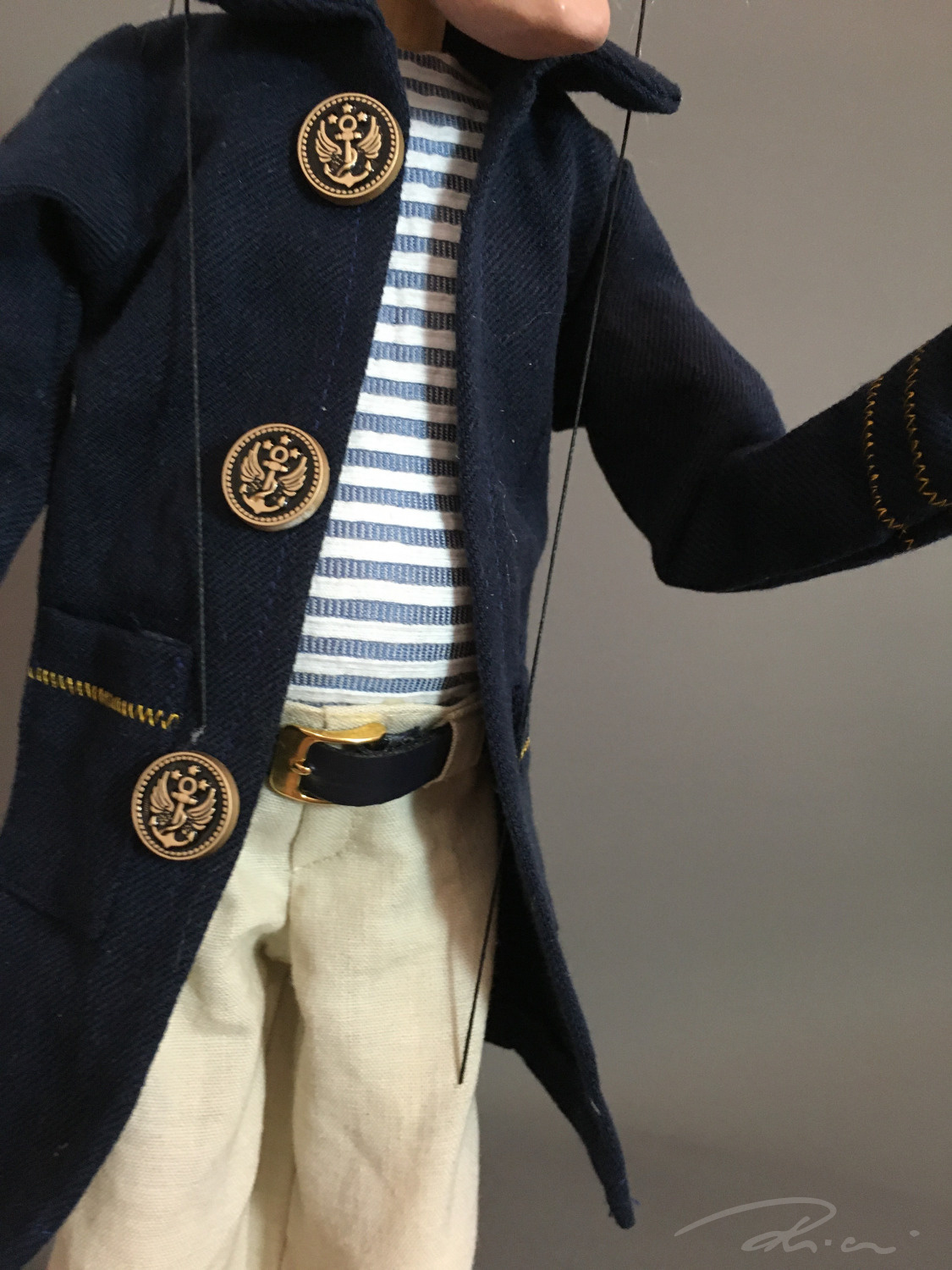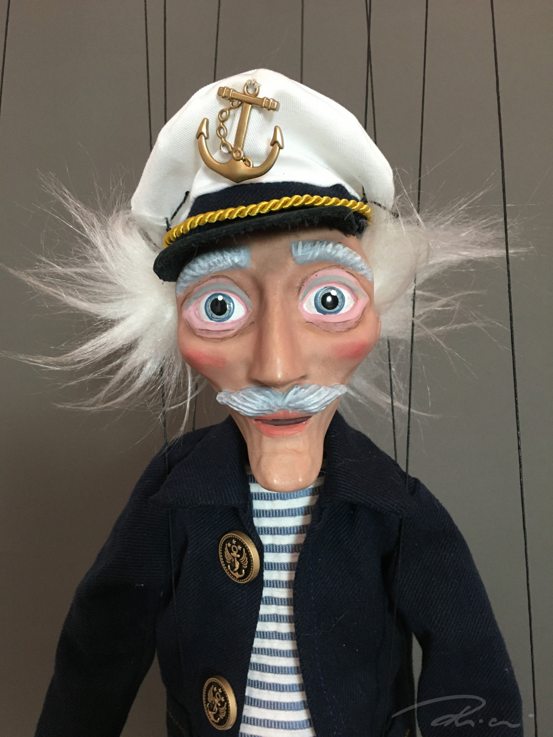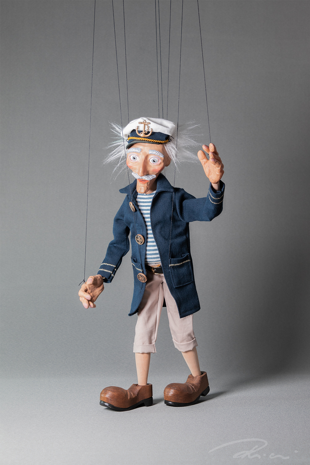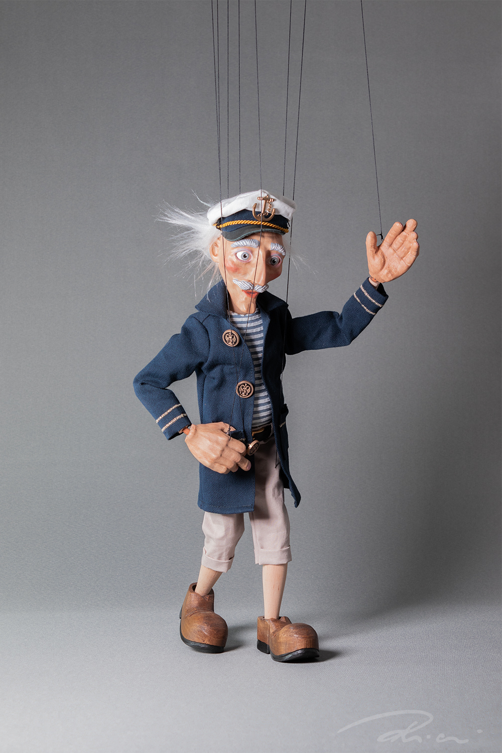 Dressed in classic maritime style – a navy-striped shirt, dark blue coat with anchor-embossed metal buttons, and of course, his signature captain’s hat. Every detail captures his spirit.