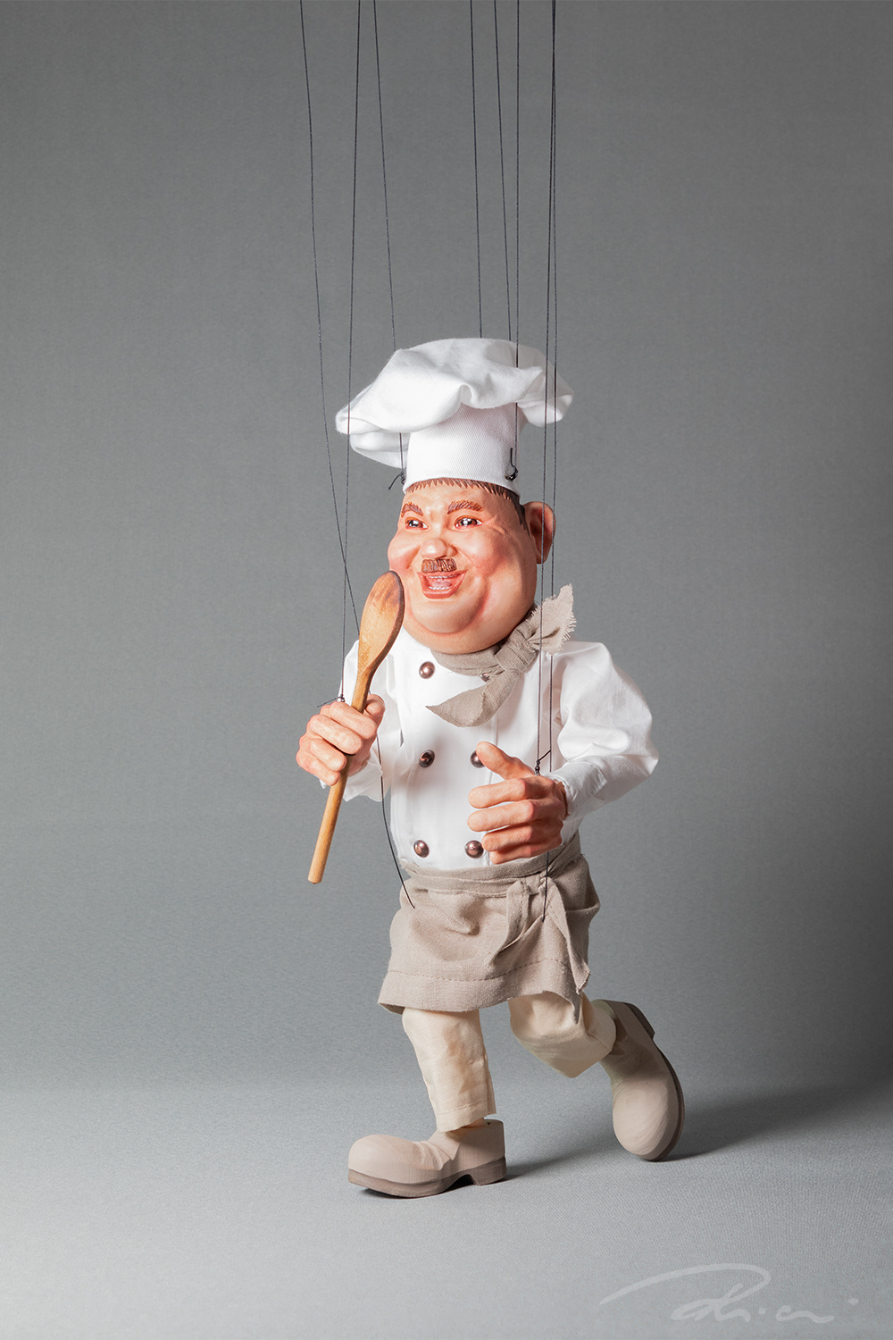 Kitted him out with all the essentials: a wooden spoon in hand, a traditional chef’s hat on his head, a classic white uniform with copper buttons, and a linen apron to top it all off. His round belly only adds to the charm.