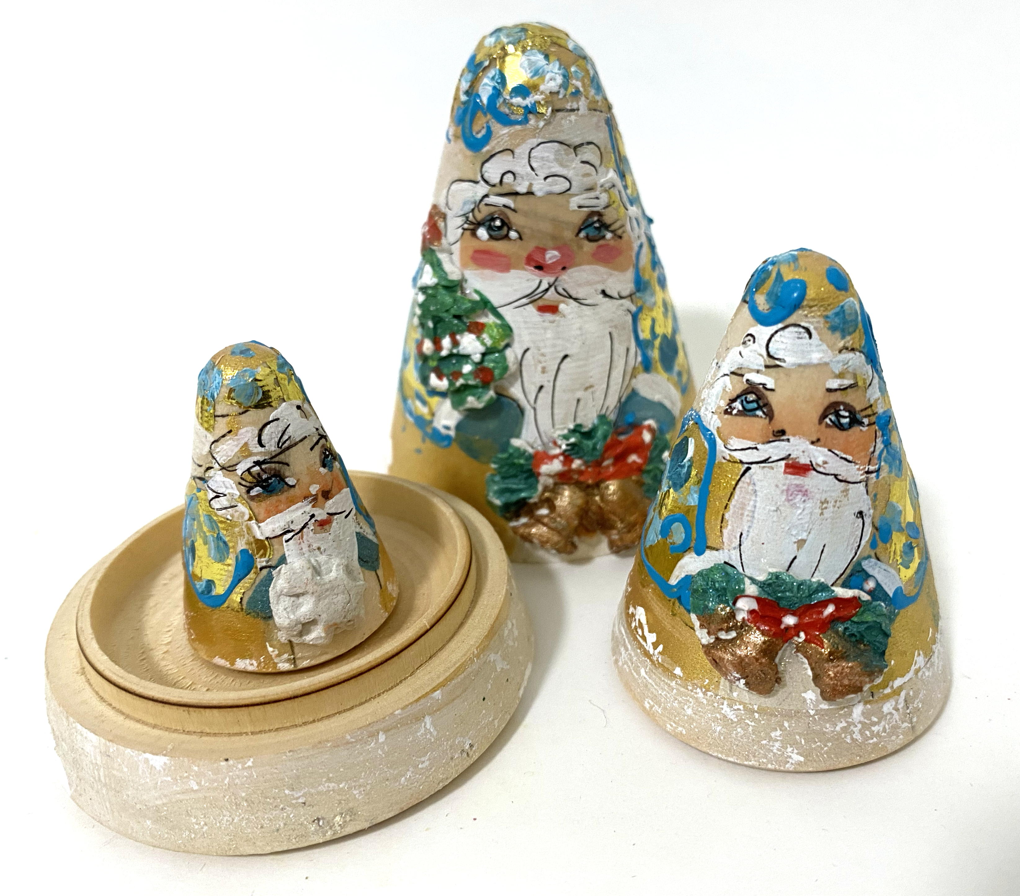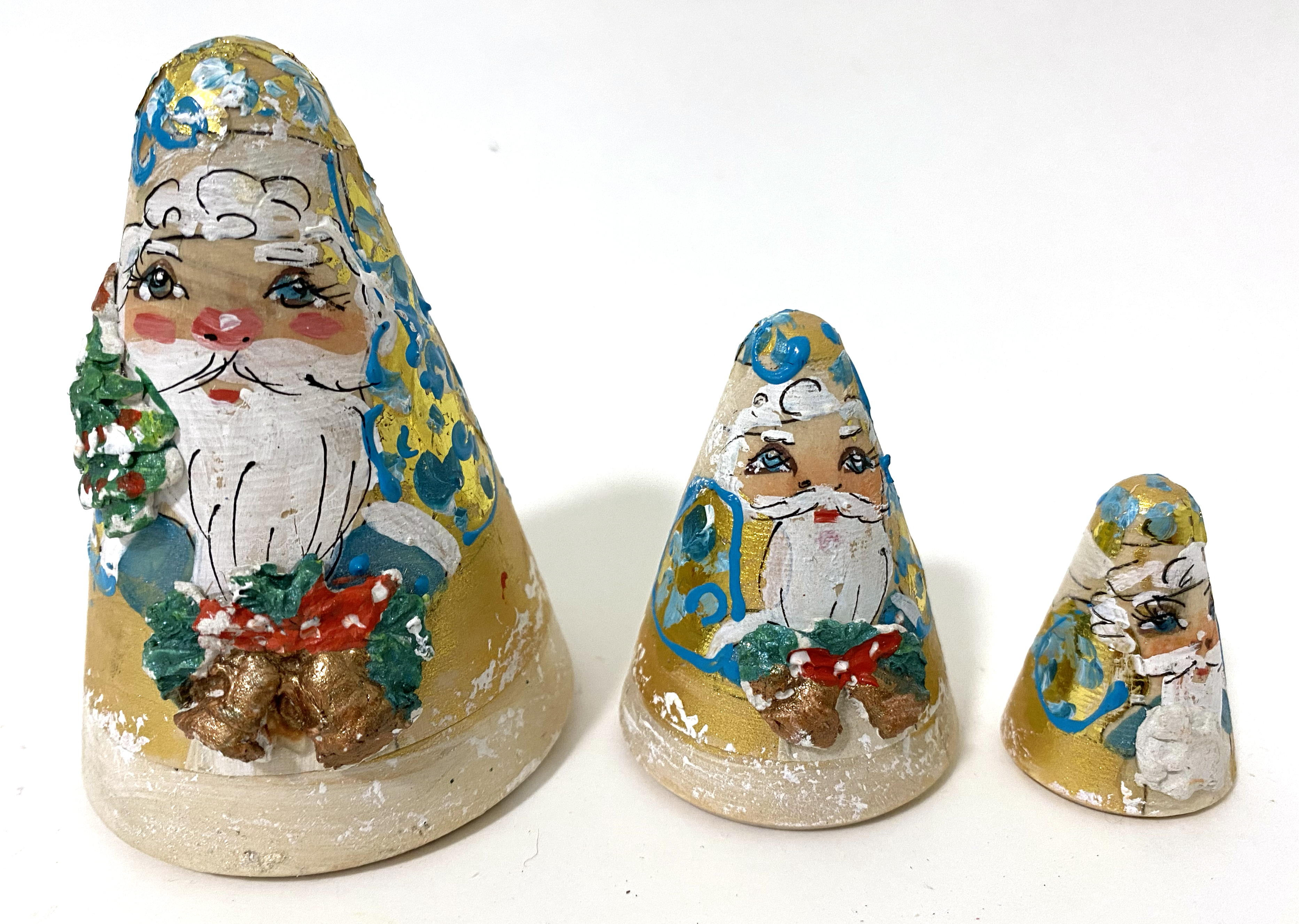 Bring a touch of whimsical holiday charm to your home with this beautifully hand-painted 3 piece Santa nesting doll set. Crafted in a unique cone shape, each figure features a cheerful, rosy-cheeked Santa adorned with festive gold, blue, and green detailing. Unlike traditional round matryoshkas, these rustic figures are carved in tapering forms, giving them a distinct sculptural presence. Lightly distressed paintwork adds vintage appeal, making each piece feel like a cherished heirloom. Perfect for seasonal décor, gifting, or as a standout collector’s item, each doll is handcrafted from solid wood and nests neatly inside the next. This is traditional Russian folk art with a festive twist — a delightful addition to any Christmas display. .